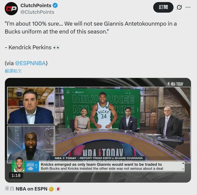 Shams透露,如果要離開雄鹿,字母哥唯一想去的球隊(duì)就是尼克斯。